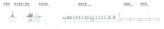 開卷機---較平一體機---沖孔----成型機組----成型剪-----放料架